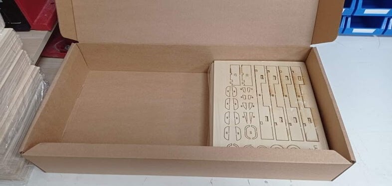 Despiece de componentes en latón, resina ecológica 3D y madera corte láser.